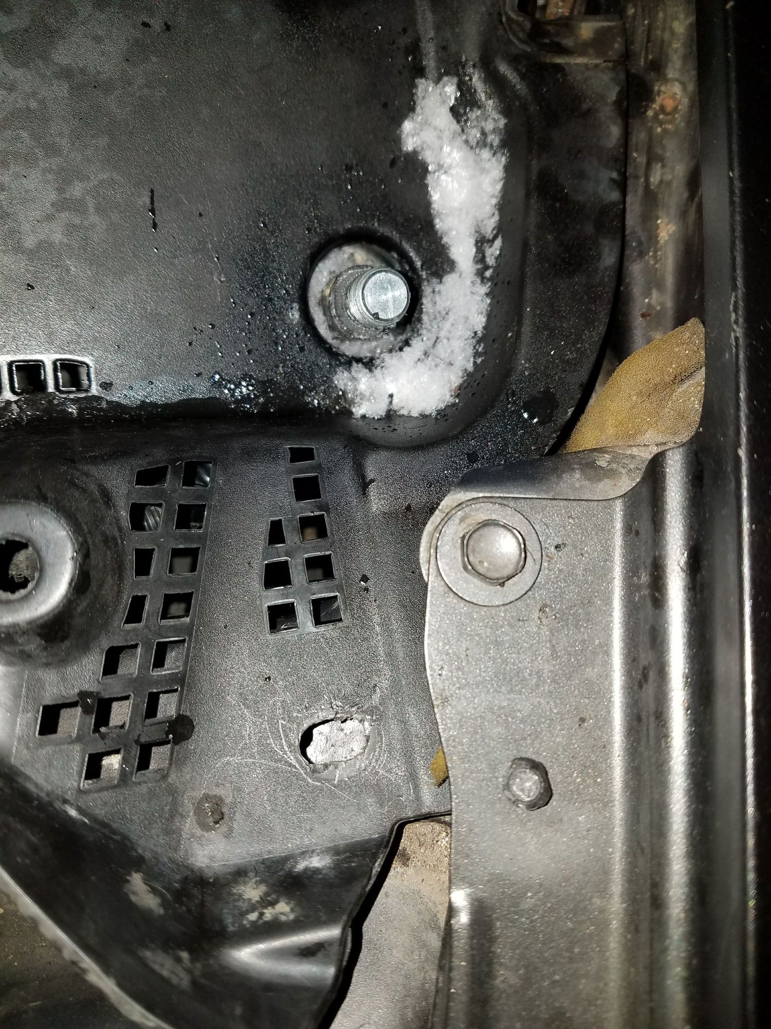 this driver's side of the under cowl is a massive PITA to remove - I ended up lifting the loose end (center engine), putting my wrist underneath this end (at the quarter panel/driver's side) and bumping from underneath. I'm still not sure how I got the sucker back in, but I did after several loooooooong minutes.
