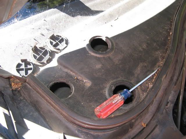To reach the three nuts holding the top of the strut in place, open the hood, then remove the three nut covers right in front of the windshield. Use your flat head screwdriver to pop them off.